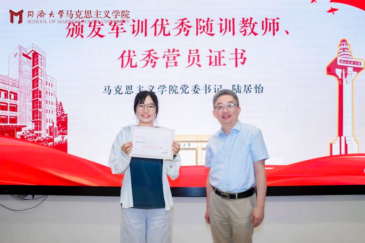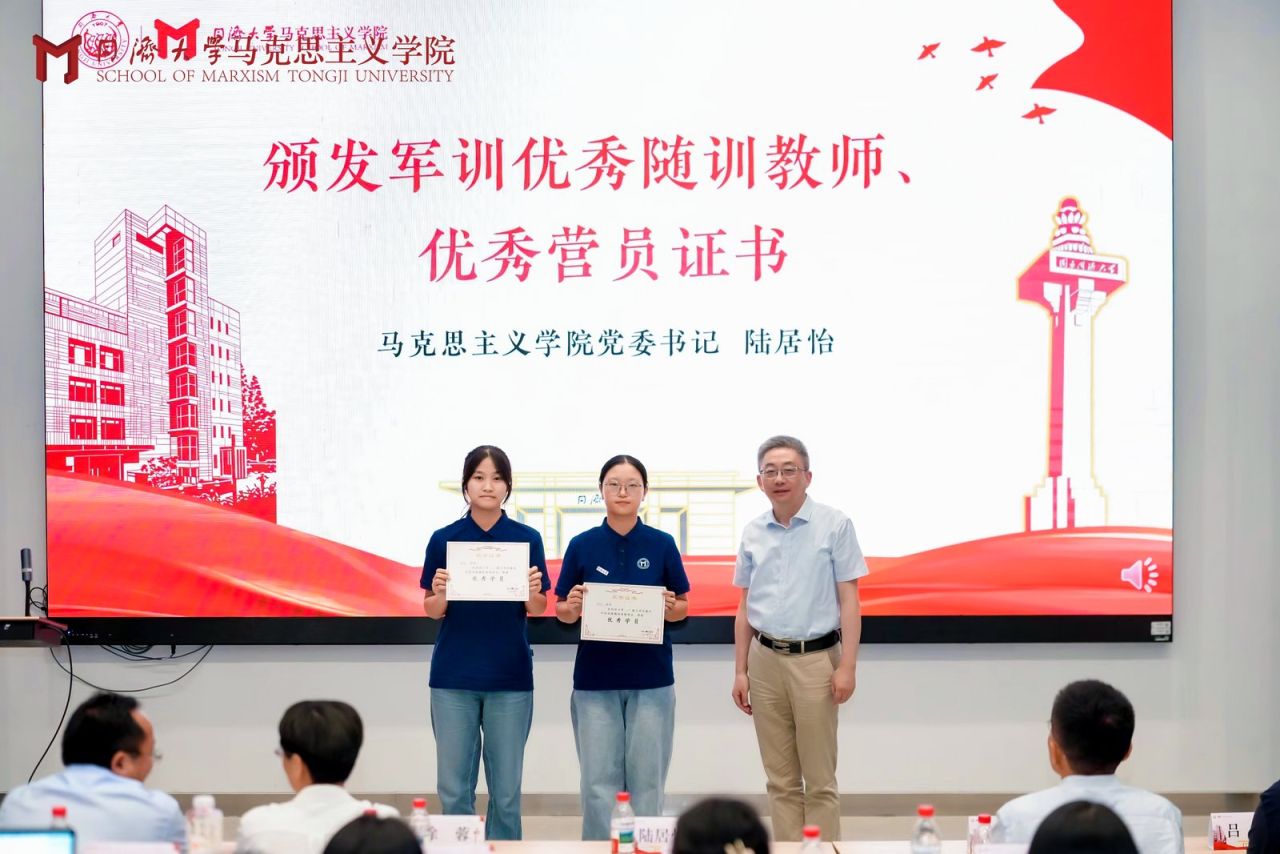 在开学前的军政训练中,2025级本科生们以挺拔的军姿、昂扬的斗志展现了新时代青年的蓬勃朝气与青春风采。学院党委书记陆居怡为在军训中表现突出的同学颁发“优秀营员”证书,为在军训中辛勤付出、悉心指导的教师颁发“优秀随训教师”证书,彰显三全育人理念。