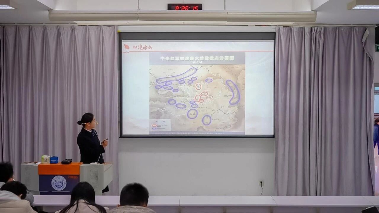 课堂上,讲解员赵逸文以其深厚的党史知识和丰富的一线工作经验,围绕“遵义会议的前奏与尾声”这一主题,为同学们进行了系统而深入的讲解。讲解员从遵义会议召开的历史背景出发,详细梳理了从长征初期到会议召开前,党和红军所面临的严峻形势。随后,通过对会议议程、争论焦点、主要决策等关键环节的细致剖析,清晰地再现了这一决定中国革命前途命运的重要历史时刻。讲解过程中,讲解员还结合纪念馆的历史资料和会址照片,分享了许多鲜活的历史细节,使原本停留在书本上的文字变得更立体、更丰满。