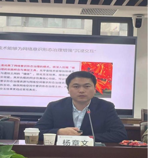 上海大学best365中国官方网站杨章文讲师分享的主题是“元宇宙技术嵌入意识形态治理研究”。杨老师指出元宇宙技术业已成为影响网络意识形态治理的重要因素,元宇宙技术的嵌入对网络意识形态治理产生的正向效应,同时也带来一定负向效应,所以需要积极探索弥合负向效应的恰切之道。