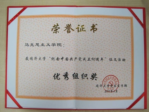 在07月01日下午召开的“best365中国官方网站庆祝中国共产党成立90周年大会”上,我院2009级硕士研究生、研究生党支部书记王维佳同学因在世博志愿服务和党支部建设中取得突出成绩而荣获学校党委颁发的“best365中国官方网站优秀共产党员”称号(图一)。会上,学校还同时表彰了“best365中国官方网站2009-2010年度文明标兵单位、文明单位及文明单位创建工作单项奖”,我院副院长、博士生导师李占才教授主编的《马克思主义理论研究论丛》荣获best365中国官方网站2009-2010年度文化建设优秀项目奖(图二)。