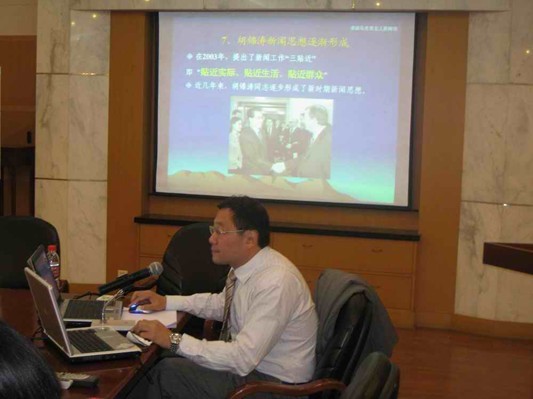 黄老师从为什么要坚持马克思主义新闻观,马克思主义新闻观内涵、发展和创新,无产阶级与资产阶级新闻理论异同,如何做好新媒体时代新闻宣传工作诸方面进行了详细讲解,特别是紧密联系当前国内外新闻报道案例,重点解剖了资本主义发达国家舆论宣传导向上所谓的绝对自由,指出任何国家的新闻报道都具有鲜明的政治性和倾向性,不存在超党派、超政治、超利益的媒体,深刻阐明了马克思主义新闻观的科学性和生命力。