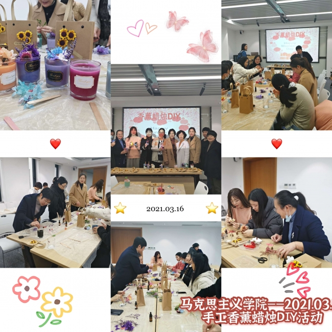 赴芬芳之旅,共庆节日之喜悦。香薰蜡烛作品,体现了马院女教师们的生活态度,展现了大家阳光团结的向上风采。制作完成的香薰蜡烛既可以点燃使用,也可作为装饰品使用,这份亲手完成的节日礼物使大家在工作之余调节了身心、陶冶了情操,丰富了生活。