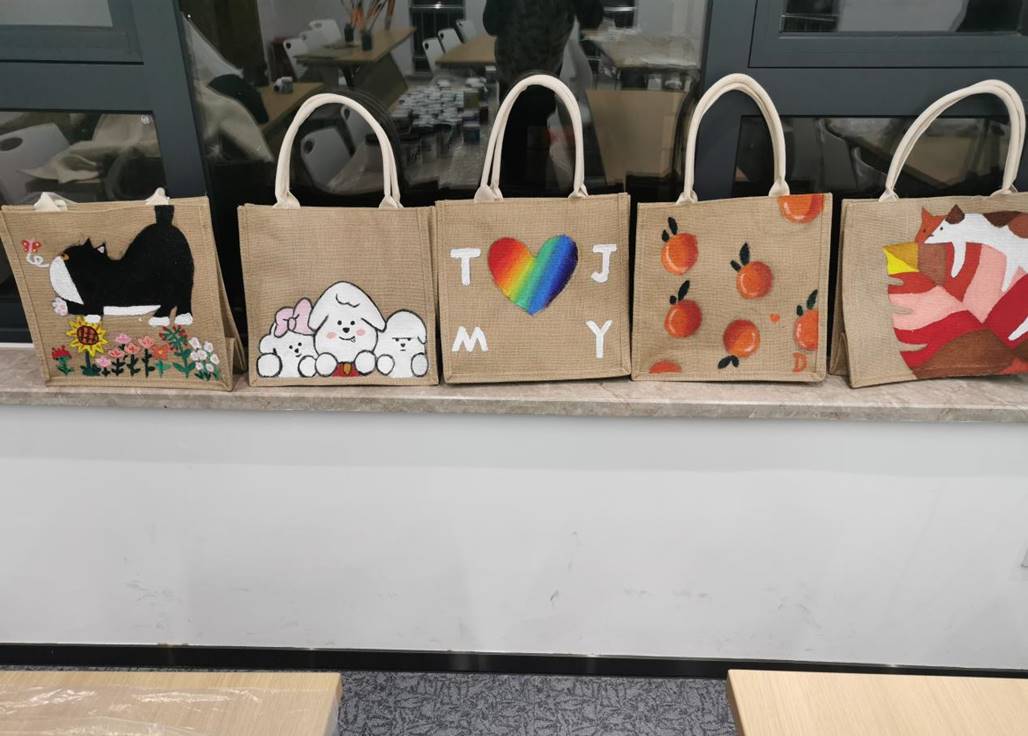 活动开始,指导老师详细介绍了手绘帆布包的注意事项和绘图技巧,并展示了活动的所需材料。老师们挑选并设计了各自的专属图案,用绘图笔描绘勾勒图案边线,以烯颜料调出深浅不一的手绘配色,再上色勾边静待风干。在热烈交流和相互协作中,一幅幅生动的画作跃然于包上,或活泼明媚,或典雅别致,为大家带来了创作的艺术乐趣。