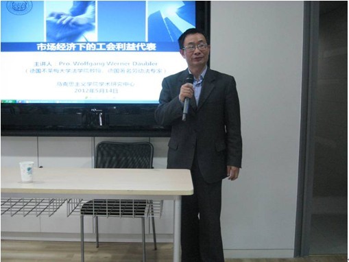接着,Wolfgang Werner Däubler教授讲述在社会主义制度下工会的地位与作用。他认为,与资本主义的市场经济相比,社会主义的市场经济具有不同的特征。比如土地公有制,个人只有几十年的土地使用权;关键行业由国有企业掌控;在社会主义市场经济条件下,缺乏整体的市场规划等等。Wolfgang Werner Däubler教授谦虚地表示对于社会主义条件下的工会了解不多,希望通过不断交流来丰富这方面的知识。