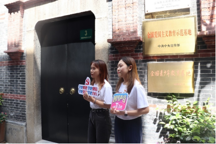 直播开始,张琪同学和任荷灵同学从中国社会主义青年团中央机关旧址纪念馆正门出发,带领大家开启新渔阳里之旅,并以互问互答的形式讲述了革命阵地大多选在石库门的原因,以及石库门的来源和革命先辈们在这里偷偷学习马克思主义的故事。