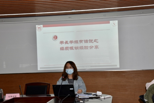 会议伊始,特邀嘉宾贾则琴同学分享了其关于学生活动经费使用的相关经验。贾则琴围绕学生活动经费报销流程、需提交材料、发票种类及粘贴要求四个方面进行了细致的讲解,尤其是对不同额度的经费做了关于发票的特别说明,并且给大家展示了学生活动经费实际使用表、学生活动经费支出凭证专用信封等。以图片、表格和实物的形式辅以说明,贾则琴通过形式多样的展示形式,帮助参会成员更加直观地理解经费报销情况。